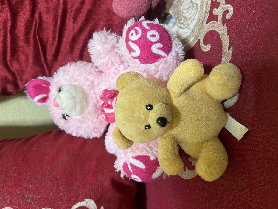 - "A pink teddy bear with white circles and the word "love" in pink on them, lays next to a golden-brown teddy bear on a red cushion" by FM-HpdTa2, licensed under CC BY 4.0