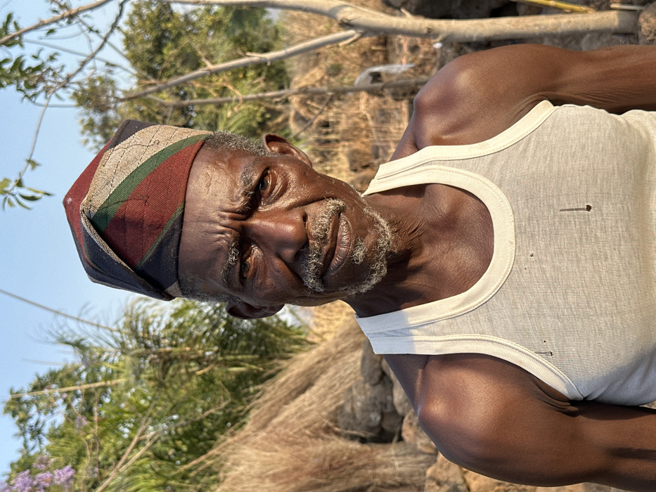 An elderly Black man gazes intently, wearing a multi-striped hat and a white tank top with small holes. The background includes trees, foliage, and a weathered, fibrous structure. He has a graying beard and wrinkles, evidence of age. The lighting suggests an outdoor setting, possibly during the day, with natural sunlight casting shadows and highlighting textures.