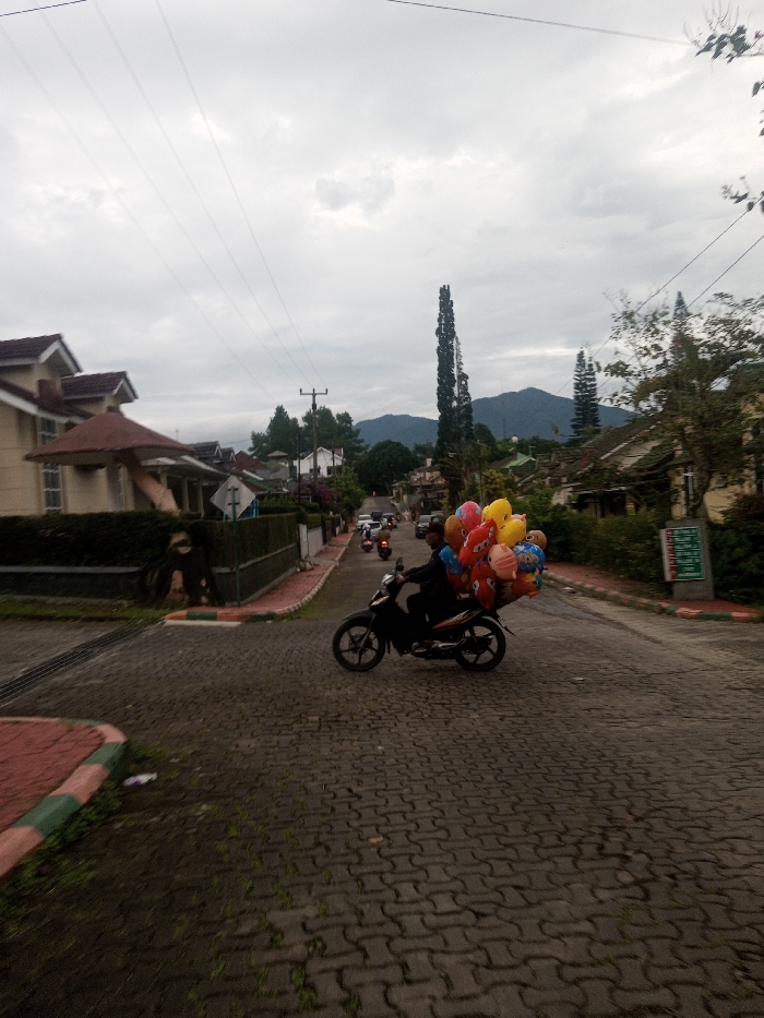 The image presents an overcast daytime street scene in Suddepalle, India. A dark-colored motorcycle, driven by an individual wearing a dark helmet and dark clothing, is positioned in the lower-center, moving forward on a grey interlocking paver road. The motorcycle's rear is heavily laden with a large, clustered arrangement of approximately twenty to thirty inflated, multi-colored balloons, many featuring cartoon character graphics in hues such as yellow, red, blue, orange, and pink. The street is lined with residential buildings of varying architectural styles, some featuring terracotta-colored roofs. Green hedges and fences border the properties. A red and green painted curb defines the road's edge. A drain grate is visible on the left side of the road. In the mid-ground, further down the street, several additional motorcycles are visible in a line, also moving forward. Utility poles and overhead power lines are present across the upper portion of the frame. Tall, slender trees are scattered throughout the environment, and distant mountains are visible under the cloudy sky. A green informational sign with white text is positioned on the right side of the road.