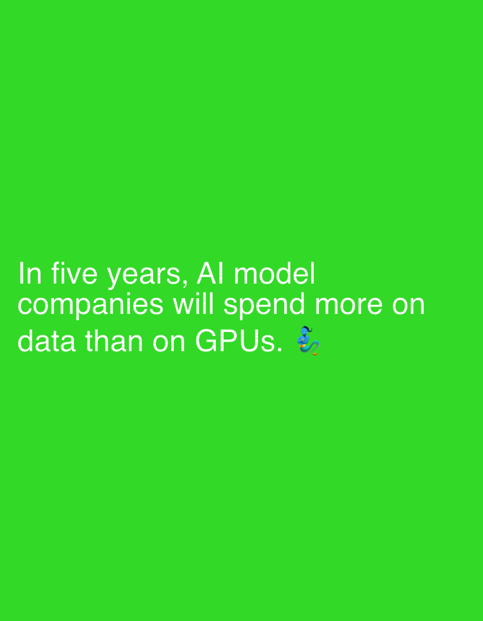 The scene, located in Erba, Italy, consists of a solid, uniform vibrant green background. Positioned in the lower-middle section of the image is white sans-serif text that reads: "In five years, AI model companies will spend more on data than on GPUs." Following the sentence's period is a small, blue genie emoji, depicting the head and upper torso with a turban and a small earring. There are no other discernible subjects, objects, people, actions, or interactions within the image.