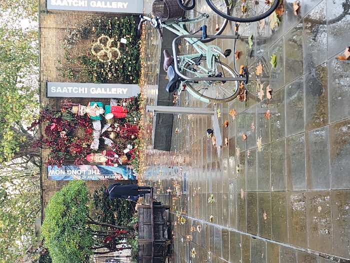 The image depicts an outdoor scene in front of the Saatchi Gallery on King's Road in Chelsea, London, United Kingdom. The foreground consists of a wet, tiled pavement scattered with numerous brown and green autumn leaves, reflecting the overcast sky. To the right, a light green bicycle with a front basket is secured to a silver metal bike rack. A portion of a second bicycle's front wheel is visible next to it. A dark, cylindrical object lies on the wet pavement near the bike rack. In the midground, a person wearing a dark coat and hat stands with their back to the viewer, facing a prominent Christmas decoration display. To the left of the person, a large wooden planter contains a round, leafy green tree. The background features the exterior wall of the Saatchi Gallery, constructed of light brown brick. A large, elaborate Christmas display is mounted against this wall, featuring dense red foliage, baubles, and two oversized Nutcracker-style figures: one red-uniformed figure playing a drum and another green-uniformed figure playing a horn. To the right of this, several smaller Christmas trees are decorated with lights, including a large, glowing white, knot-shaped ornament. Vertical signs bearing "SAATCHI GALLERY" in white text on a dark background are visible, along with a larger banner advertising "SAATCHI GALLERY AT 40 THE LONG NOW." A large tree with sparse foliage rises above the gallery wall.