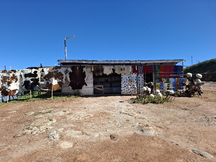 The scene is a storefront in Escarpment, Kenya, located at latitude -1.023 and longitude 36.622. The storefront is a single-story, white building with a tin roof. The building has a small, open-air section in front, covered by a canopy. It is stocked with various items for sale, including cow hides, fabric, and hats. Several cow hides are hanging in front of the storefront, secured by ropes. There are several other items, including hats and fabric, displayed outside of the storefront. The storefront is situated in an open, dirt area surrounded by low, green vegetation. The ground in front of the storefront is dirt and gravel, while the ground to the left of the storefront is mostly grass and dirt. There is one light pole in front of the storefront. The sky is clear and blue. There is a small hill in the background behind the storefront. The storefront appears to be closed, and there are no people present.