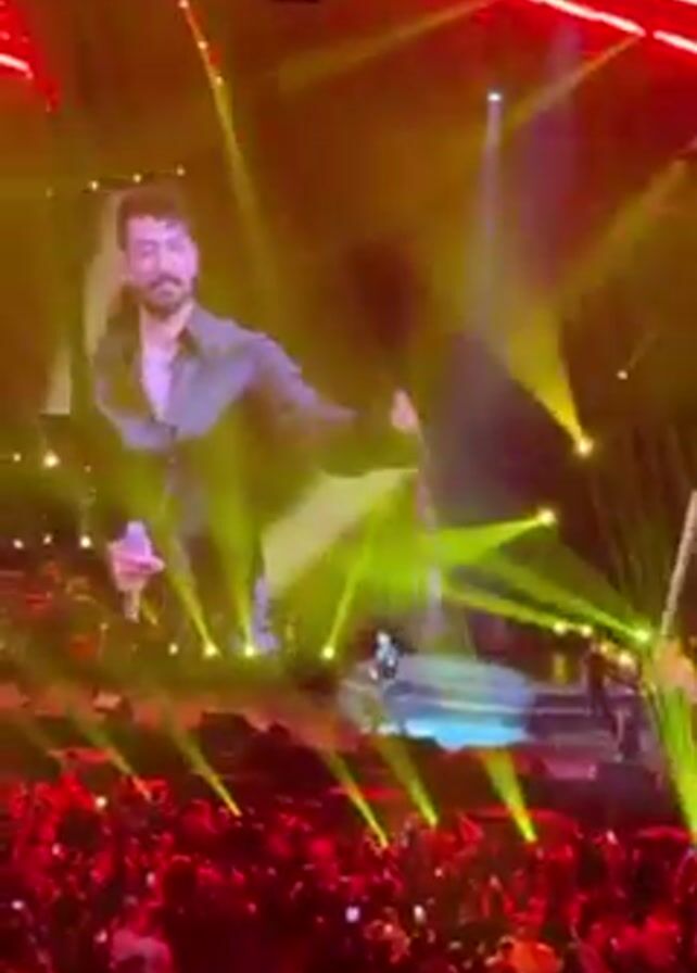 A crowd of people are watching a concert. The performer is on stage, and a large screen behind him shows a close-up of his face. The stage is lit up with bright yellow and red lights. Many people in the crowd are holding up their phones.