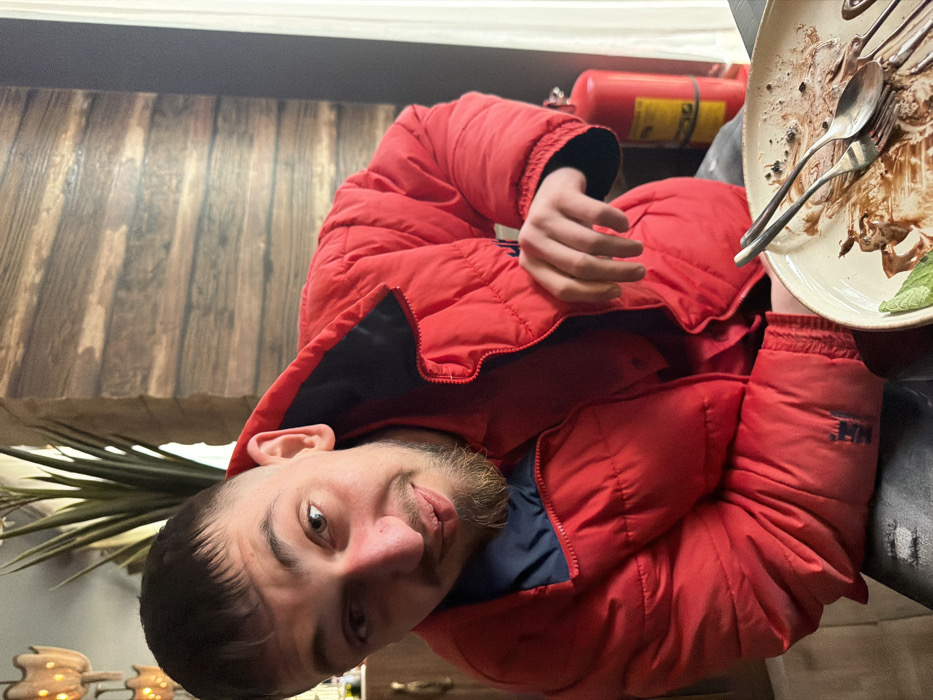An indoor scene in the city of Lyuben Karavelovo, Bulgaria, depicts a male individual seated at a table. The subject has short dark hair with faded sides, a short light-brown beard, and is wearing a red puffer jacket with a navy blue inner collar and dark-colored trousers. He is positioned with his torso angled, looking directly towards the viewer with a slight smile. His left hand is raised, partially obscured by the jacket's opening. In the immediate foreground, a white ceramic plate contains remnants of a dark-colored dessert, possibly chocolate, along with a single green leaf garnish. A silver-colored fork and spoon rest within the dessert remnants. The background features a dark brown wooden paneled wall to the right, a tall green plant behind the subject's left shoulder, and a decorative gold-toned light fixture on the far left. A red fire extinguisher with a yellow instruction label is visible on the right side of the frame, positioned against a light-colored window or curtain.