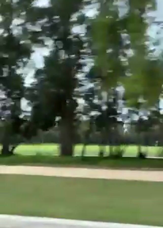 view from a moving vehicle driving past a grassy area with trees. There is a pale, light-colored curb visible at the bottom of the frame. The sky is overcast.