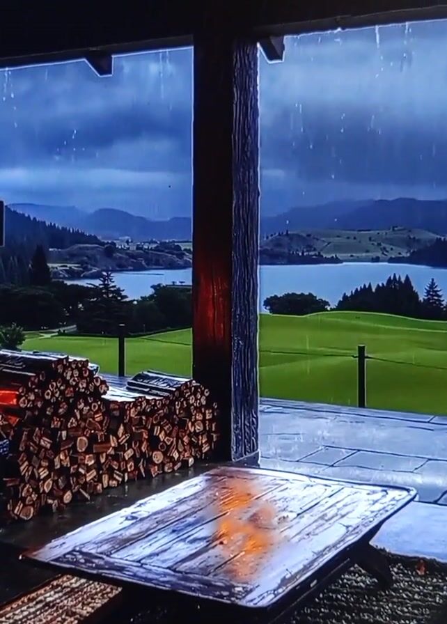 The scene depicts a cozy indoor-outdoor setting with a stone fireplace burning brightly on the left. A pile of stacked firewood sits next to it. In the center, there is a weathered wooden table. To the right, a beige sofa is visible. Through the porch's open structure, a landscape of rolling green hills, trees, and a lake can be seen. It is raining heavily, and the sky is overcast with dark clouds.
