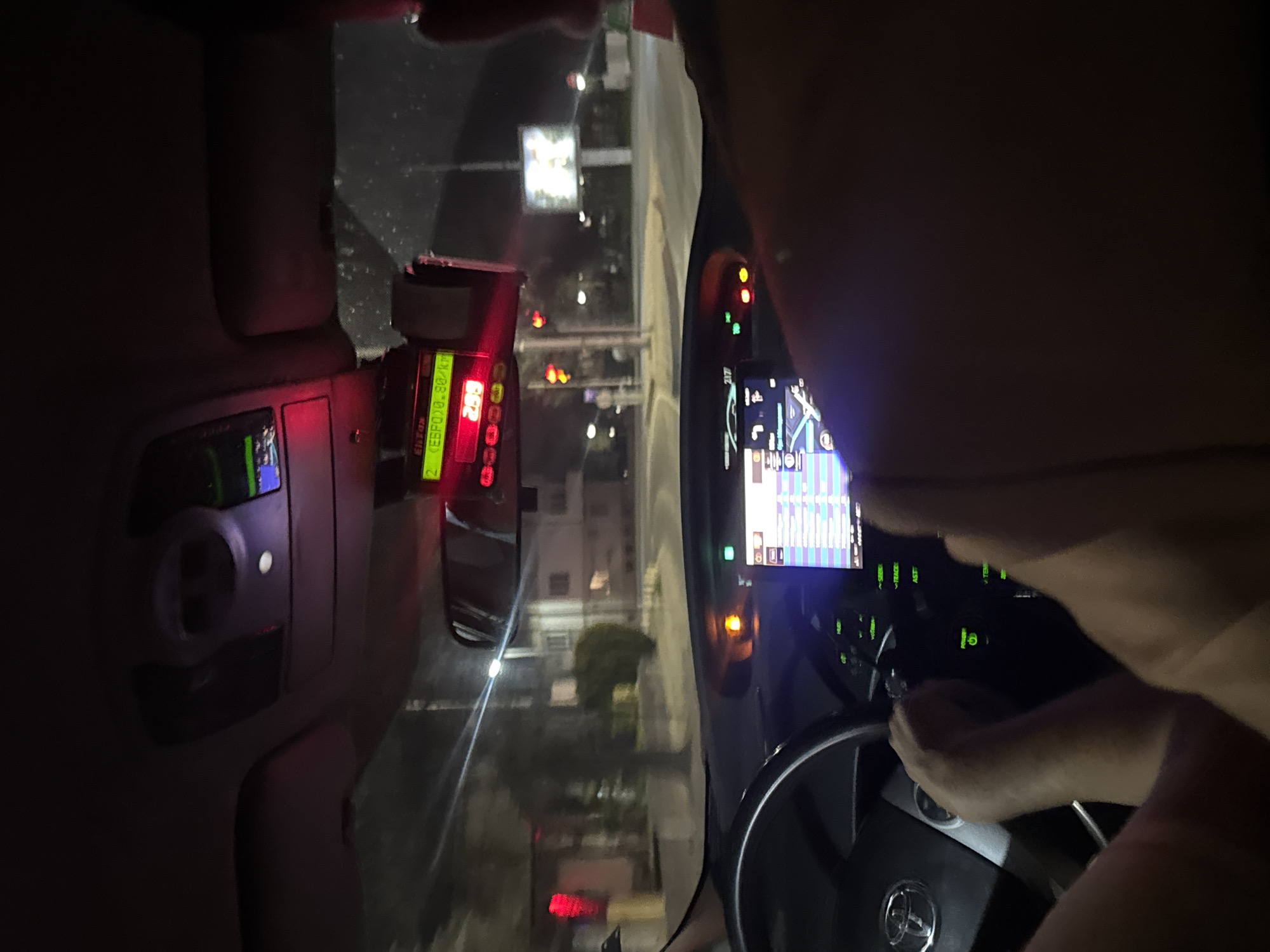 The scene depicts the interior of a vehicle at night, observed from a passenger's perspective, looking forward through the windshield onto a city street in Plovdiv, Bulgaria. A driver's hands are visible on a Toyota-branded steering wheel. The dashboard features an illuminated digital display, likely an infotainment or navigation system, with various green and orange indicator lights. Above the dashboard, mounted prominently, is a red-lit electronic device, identified as a taximeter or ride-sharing unit. It displays "ЕЛТОН", "2 (ЕБРО)0.80 /км", and the number "289". The arm and shoulder of a passenger are visible in the lower right foreground. Outside the vehicle, the street is paved and illuminated by streetlights. Multiple red traffic lights are visible ahead, suggesting the vehicle is stopped at an intersection. Buildings, likely residential or commercial, line the street in the background, interspersed with trees. A distant, illuminated billboard is visible on the right side of the road. The overall environment is an urban streetscape at night.