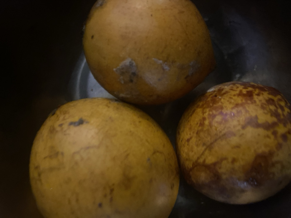 - "The image displays three spherical to ovoid fruits, consistent with African star apples (Chrysophyllum albidum), resting within a dark, indistinct container" by FM-fraEP2, licensed under CC BY 4.0