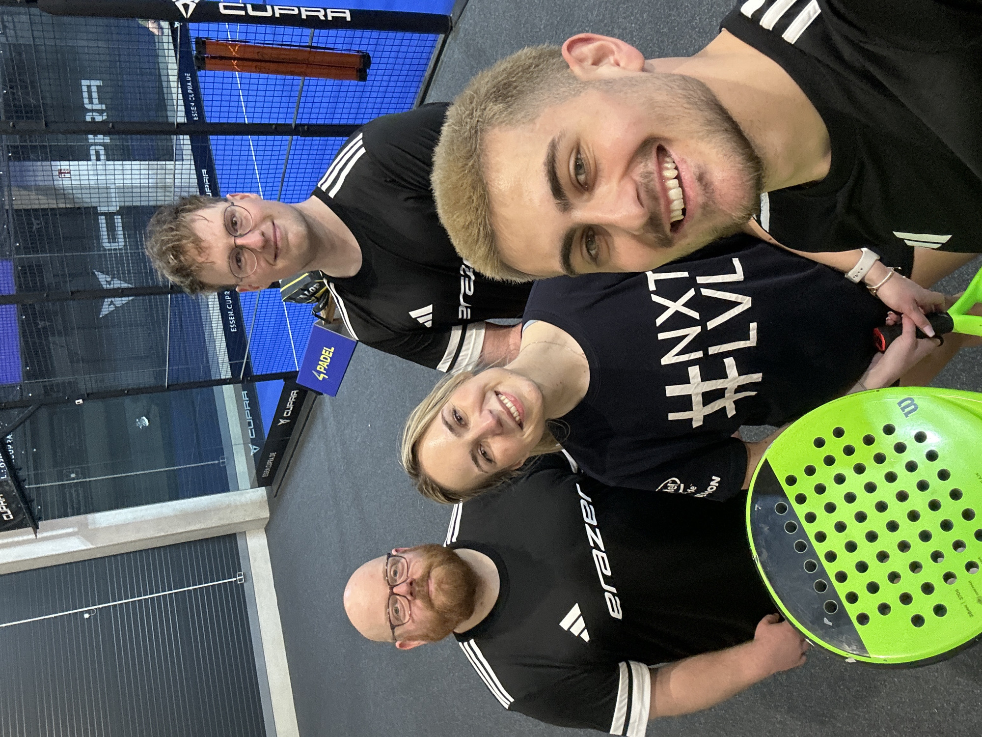 Four individuals, three males and one female, are posing for a photograph inside a padel sports facility in Essen, Germany. The foreground shows a young adult male with light brown hair, light eyes, and light stubble, smiling directly at the camera while holding a neon green padel racket. To his left and slightly behind him, a female with blonde hair and a dark shirt featuring "NXT #LVL" text smiles at the camera, holding a padel racket handle with a red grip. Behind the female, a bald male with a red beard and glasses wears a black Adidas t-shirt with "erazer" text. To his right and behind the foreground male, another male with light brown wavy hair and glasses wears a black Adidas t-shirt with white stripes, also smiling at the camera. The environment is a padel court characterized by a blue playing surface, clear glass walls, and black wire mesh fencing. Visible sponsor branding includes "CUPRA" and "ESSEN.CUPRA.DE" on the court's structures, along with a blue sign marked "4 PADEL". The floor where the individuals stand is a dark gray, textured sports surface. In the far left background, a dark corrugated wall and a light-colored concrete structural pillar are discernible.