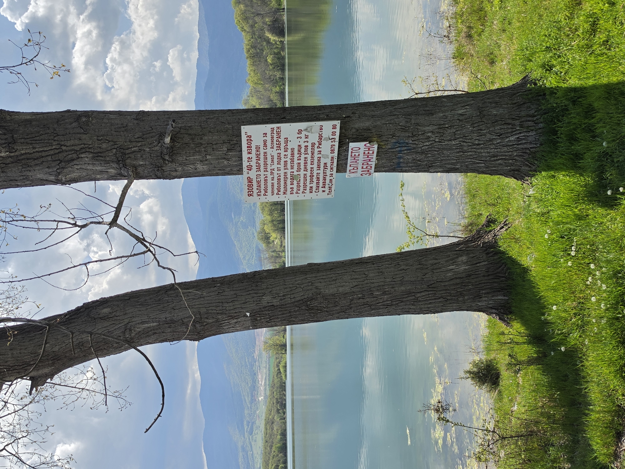 The image depicts a lakeside scene in Muldava, Bulgaria. Two trees stand in the foreground, their trunks positioned vertically in the frame. Two signs are nailed to the trunk of the tree on the upper portion of the frame, one larger and one smaller, each in Bulgarian. The signs warn against swimming and discuss fishing restrictions and rules. Behind the trees, the lake reflects the sky and the mountainous landscape. Grass and vegetation line the water's edge. The sky is blue with scattered white clouds. The overall impression is of a natural, protected environment with rules enforced for its preservation.
