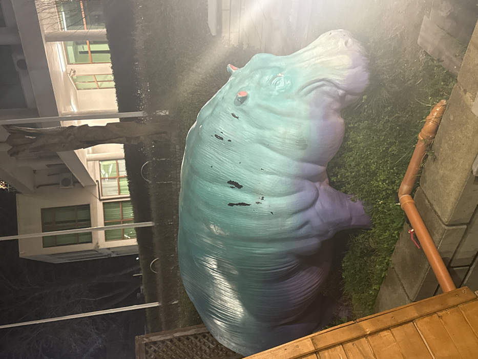 The image depicts an outdoor nighttime scene in Primorsko, Bulgaria. The central subject is a large, static sculpture of a hippopotamus, predominantly colored in a gradient from teal-green on its dorsal side to purple on its ventral side, with noticeable dark scuff marks on its back and red accents on its ears. This sculpture is positioned on a patch of green grass. In the background, a multi-story white building, illuminated by artificial light, stands. The building features several windows with green-tinted panels or curtains visible, and at least one exterior air conditioning unit. Two tall, slender white poles are visible between the hippo and the building. A low, trimmed hedge line separates the hippo's immediate surroundings from the building. The foreground contains a partial view of a wooden lattice structure on the far left. A low wall constructed from concrete or stone blocks runs horizontally across the lower part of the frame, atop which are laid terracotta-colored PVC pipes. One pipe segment features a red valve. The scene is devoid of people or discernible activity. A significant lens flare from an unseen light source is prominent on the right side of the image.