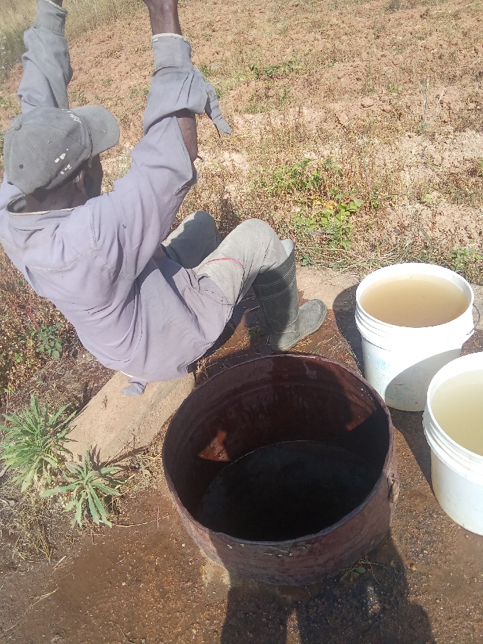 An outdoor scene in Jos, Nigeria, depicts an individual engaged in water collection or handling. A person, viewed from an elevated rear perspective, wears light grey work overalls, a grey baseball cap, grey work gloves, and black rubber boots. The individual is in a crouching posture, with both arms raised above their head and hands open, suggesting an action of pulling or lifting an unseen object. They are partially supported by or bracing against a low, irregular concrete or stone structure behind them. In the foreground, a dark reddish-brown metal barrel, cut horizontally, rests on the ground and contains a dark liquid. To the right of this barrel are two white plastic buckets. The bucket closer to the barrel is approximately two-thirds full of a light brown, murky liquid. The second white bucket, positioned slightly further right, is about half full of a similar, light-colored liquid. The ground immediately surrounding the barrel and buckets is wet, indicating recent water spillage or activity. The wider environment consists of dry, reddish-brown soil with sparse patches of green vegetation and dry grass. Strong sunlight illuminates the scene, casting distinct shadows from the person and containers.