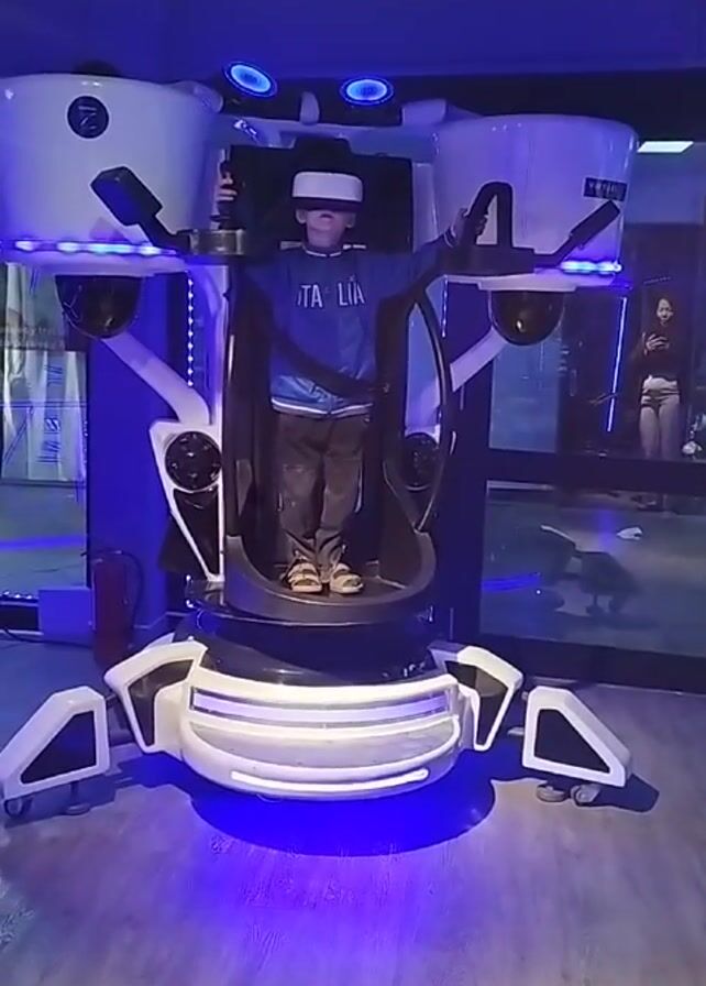 A small boy stands inside a large white and black VR simulator in a room with blue lighting