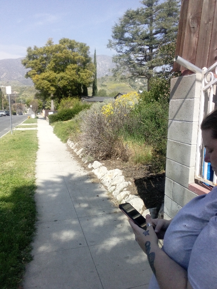 The image depicts a bright, sunny daytime scene on a residential street in the Sunland-Tujunga area, City of Los Angeles, California, United States of America. In the foreground, on the right side, a person is partially visible, oriented with their right side towards the camera and head slightly bowed. They are wearing a light-colored, possibly grey, short-sleeved top. Their right hand holds a black smartphone, with fingers actively touching the screen. A dark tattoo is visible on the person's right forearm, and a silver-toned ring is present on a finger of their right hand. The scene extends outward from the person. To their immediate right is a light-colored concrete block wall, topped with a white decorative wrought iron element and a section of wooden fence. A metallic pipe extends horizontally from the top of the concrete post, partially obscuring the wooden fence. A concrete sidewalk occupies the middle ground, running diagonally from the lower center towards the upper left. It exhibits distinct shadow patterns from overhead foliage or structures. To the left of the sidewalk is a strip of green grass, bordered by an asphalt street further left, where a white street sign on a pole and several parked vehicles are visible in the distance. To the right of the sidewalk, a landscaped strip features a row of light-colored, irregular rocks lining the sidewalk edge. Behind these rocks, various shrubs and dry grasses grow, including several bushes with small yellow blossoms. The background features prominent, rugged mountains, characteristic of the San Gabriel Mountains, under a clear, light blue sky. Scattered houses are visible on the distant slopes. Several trees are present; a large, leafy green tree stands prominently on the left side of the frame in the mid-distance, and a tall, slender coniferous tree is visible further back. Another large conifer with a broader canopy is seen on the right, behind the properties.