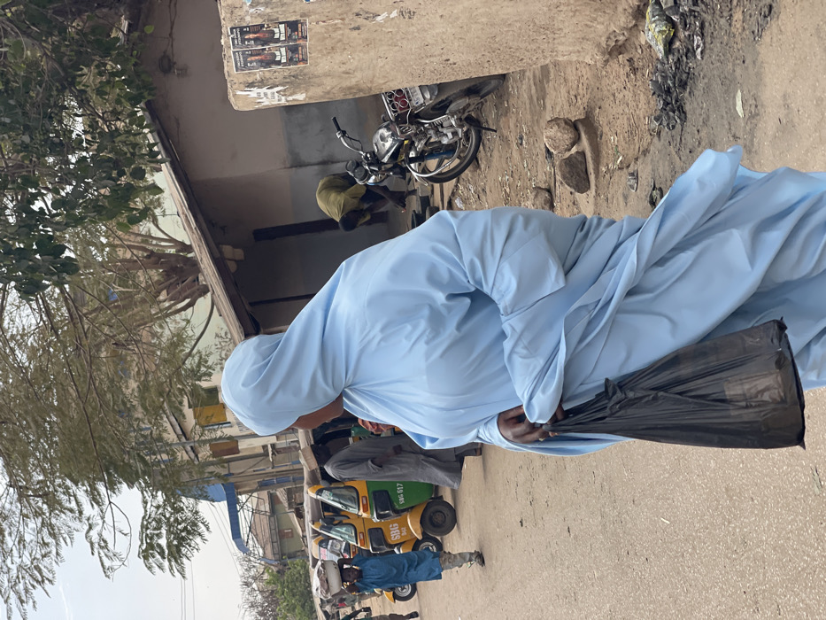 This image captures a daytime street scene in Zaria, Nigeria. In the foreground, a person of dark complexion, oriented facing right and slightly away from the camera, wears a light blue full-length garment, likely a hijab or abaya, which appears to billow slightly. This individual holds a black plastic bag in their right hand. To the left, a dusty, unpaved road extends into the distance. Parked along this road are at least three yellow and green auto-rickshaws (Keke Napep), one bearing the letters "SBG" and numbers "604" and "017" on its rear panel. A young person, dressed in a blue tunic and light-colored trousers, walks towards the left, balancing a white bowl on their head. Another individual in a grey garment is partially visible near the rickshaws. On the right side of the frame, a roughly constructed building with a light-colored upper wall and a darker base is visible. A person in a greenish-yellow long-sleeved top is bending over near this building, appearing to be engaged in an activity on the ground. A silver motorcycle is parked upright between this person and the foreground. The ground in this area is uneven, dusty, and littered with rocks and dark debris. A raw concrete pillar, partially visible on the far right, has two identical posters affixed to it, featuring dark imagery and text, possibly advertisements. Overhanging branches with sparse green foliage are visible against the bright, overcast sky.