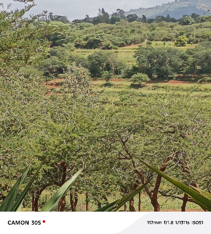 Lush greenery dominates the landscape, with layers of trees and vegetation covering a hillside. Reddish-brown earth is visible in patches amidst the green. The foreground features tall, pointed green leaves, adding depth to the scene. The foliage extends upwards, blurring into the distant hills beneath a partly cloudy sky. The image captures a vibrant and natural environment.