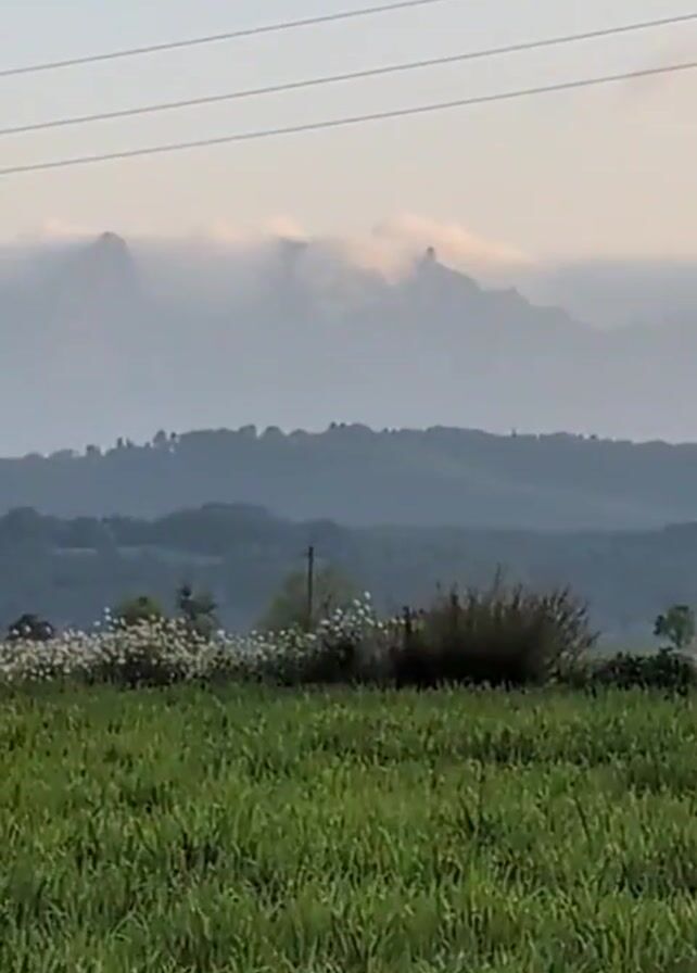 The video presents a verdant field under a partly cloudy sky. Lush green grass dominates the foreground, dotted with small white wildflowers. In the distance, a silhouette of rolling hills is visible, partially obscured by mist or low-hanging clouds, creating a sense of depth. Barely visible mountain peaks emerge from the mist, hinting at a higher elevation beyond. Power lines cut across the sky, running horizontally near the top of the frame. A tree branch with green leaves extends into the frame from the left side, adding a touch of nature to the composition. The lighting suggests either early morning or late afternoon. The overall scene is serene and pastoral.