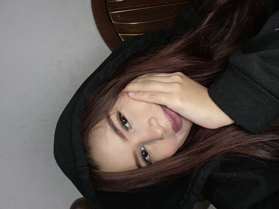 A young woman with reddish-brown hair and striking eyelashes poses in a black hoodie, with the hood pulled up. She is angled to the side, her face partially obscured by her hand, which rests against her cheek. She has on a nude lip gloss. The background is a simple combination of a grey wall and dark wood.