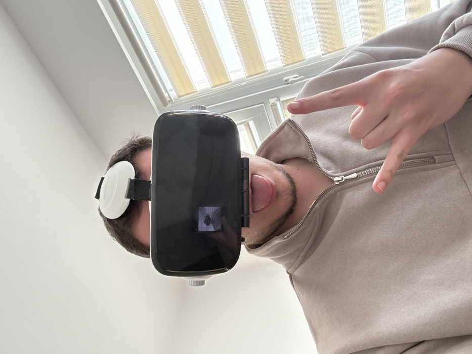 A male individual is depicted indoors, likely in Varna, Bulgaria, wearing a black and white virtual reality headset that obscures his eyes and forehead. A small, square reflective surface on the front of the headset shows a distorted reflection of the subject. He is wearing a light beige quarter-zip fleece or sweatshirt. His tongue is extended from his mouth, and his right hand, positioned in the lower right of the frame, is making a "rock on" gesture with the index and pinky fingers extended. The background consists of a plain white wall and ceiling on the left, and a window with horizontal beige and white striped roller blinds on the right.