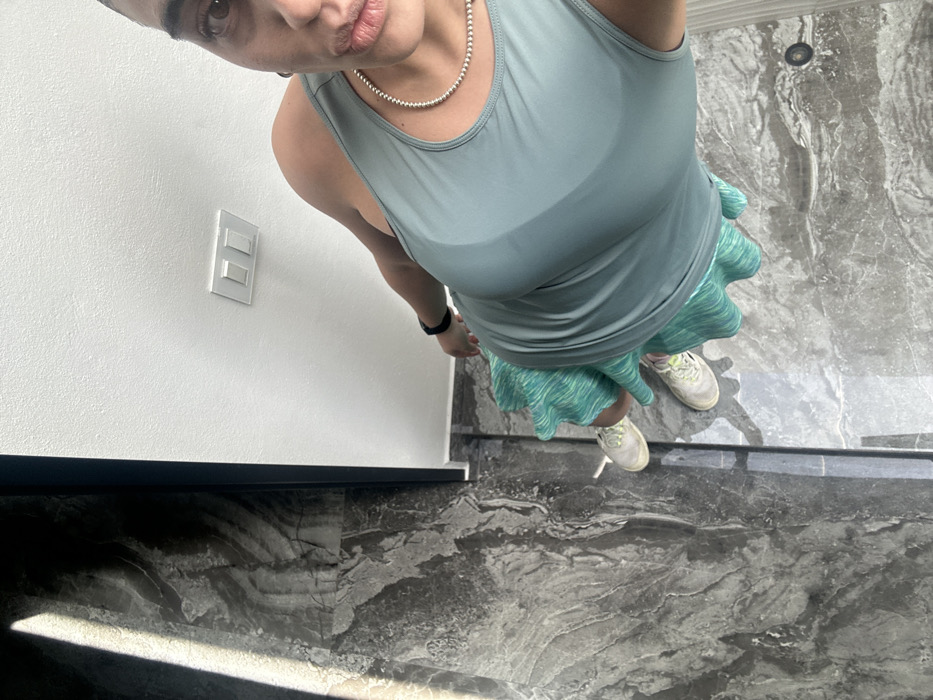 A top-down shot of a person with tan skin. She wears a gray tank top, a green and blue skirt, and white sneakers. A silver beaded necklace is around her neck, and a black watch is on her left wrist. She is standing on a gray marble floor next to a white wall with a light switch. Sunlight is visible on the floor.