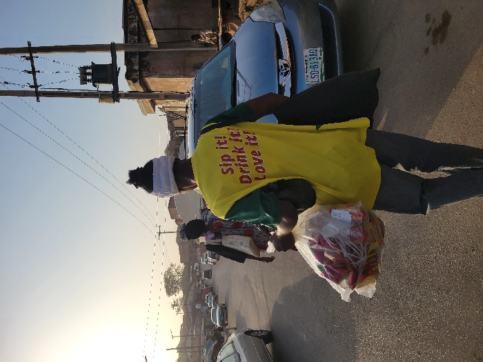 A man wearing a yellow shirt that says "Sip it! Drink it! Love it!" holds a plastic bag full of goods. The scene is an outdoor, urban setting. Cars are parked along the street. An overhead power line and transformer are visible. The license plate on the nearest car reads "LSD-813 AO".