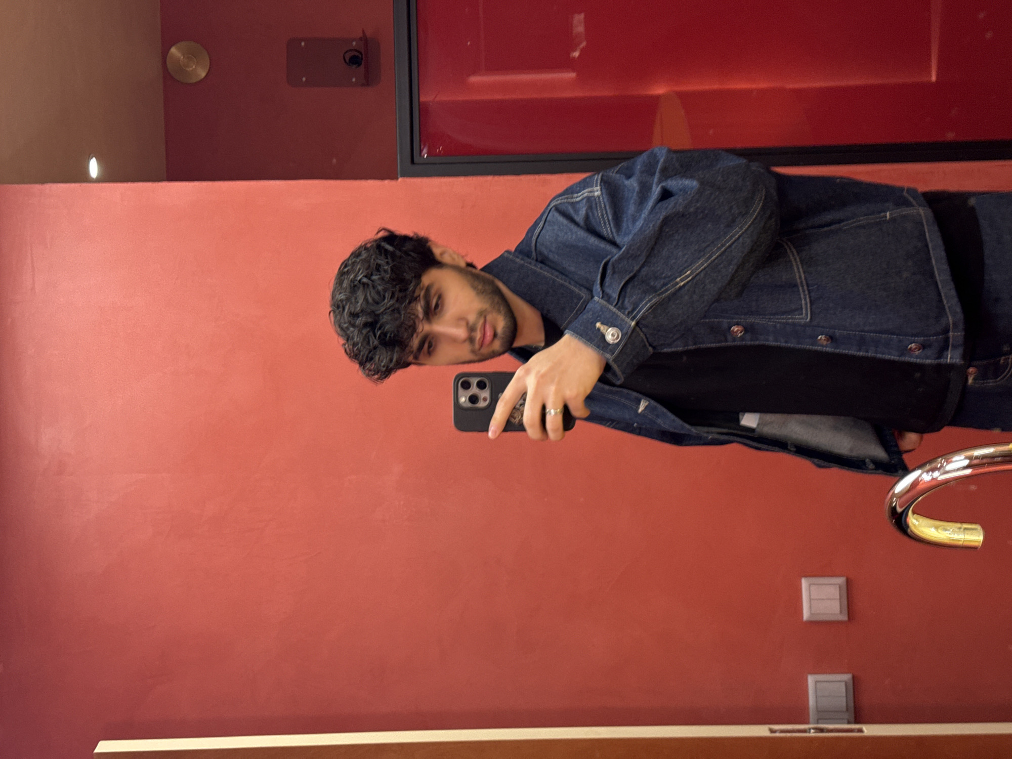 A man is taking a selfie with his smartphone in a room in Yerevan, Armenia. The man has dark, curly hair and a beard, and he is wearing a dark blue denim jacket over a black t-shirt. He is holding a dark colored iPhone with a silver ring on his left ring finger. The room has red-toned walls and a light wood-colored baseboard. Above the man and slightly to the left are a doorknob and a security camera system. Above those is a red door frame. To the right of the man is a sink faucet. Near the bottom right of the frame are two electrical outlets.