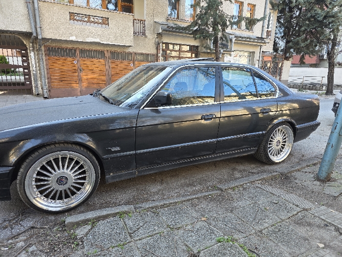 A dark grey four-door sedan, identified as a BMW E34 5-series model, is parked roadside with its left side facing the viewer