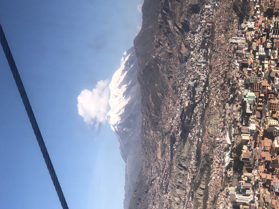 A cityscape clings to a rugged mountain range. Buildings densely cover the lower slopes, fading into the brown earth. Towering above is a snow-capped mountain, partially obscured by a large, fluffy cloud. A thick cable stretches diagonally across the blue sky, likely part of a cable car system that provides views of the landscape.