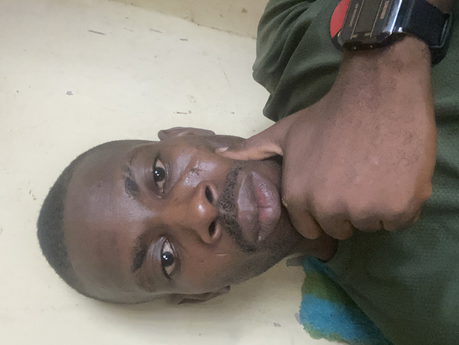 A dark-skinned man with a shaved head looks at the camera. He wears a green shirt. His hand is near his face, with a digital watch visible on his wrist. A thin, dark mustache sits above his lips. The background appears to be a plain, light-colored wall. The image is rotated, with the man's face angled to the left.