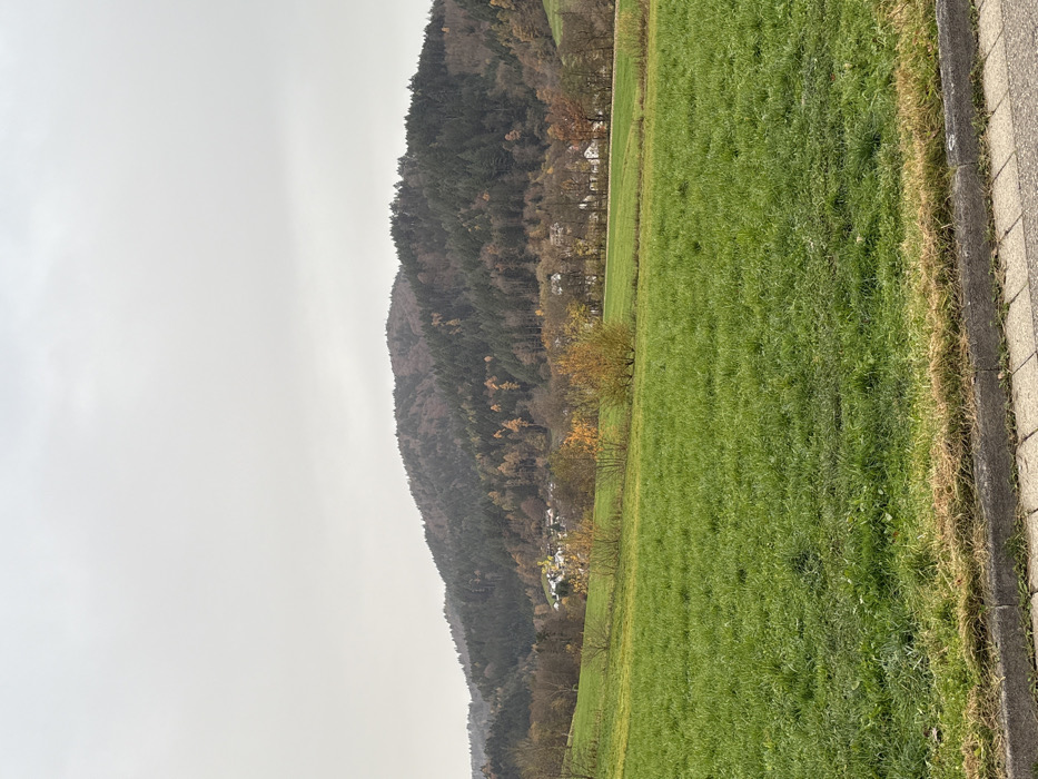 A lush green field stretches out alongside a gray stone path. The path runs along the edge of the field, separating it from a densely forested hill or mountain. The trees on the hill are a mix of green and autumnal hues. A small settlement or group of buildings can be seen nestled at the base of the hill, adding a touch of civilization to the otherwise natural landscape. The sky above is overcast, with a uniform gray color.