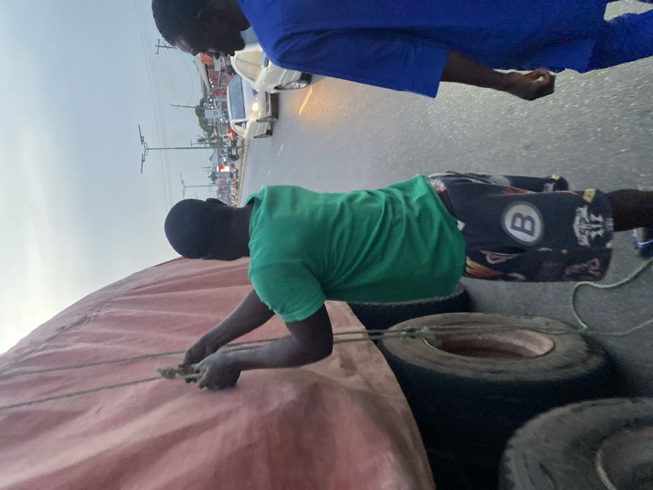 The scene depicts a street in Lokoja, Nigeria, during what appears to be dusk or dawn. An adult male, viewed from behind, wearing a green short-sleeved t-shirt and dark patterned shorts with a prominent white 'B' motif, is actively securing a large, reddish-pink tarp on the side of a cargo truck. His hands are raised, manipulating a thick rope used to fasten the tarp. Two large truck tires are partially visible beneath the tarp. To the right, a second adult male, wearing a blue garment, stands in profile, observing the action. The foreground features a wet, paved road surface. In the background, a multi-lane road carries traffic, including several white sedans with illuminated headlights. The thoroughfare is lined with modern streetlights featuring dual overhead fixtures, and commercial buildings with illuminated signs are visible further down the road.