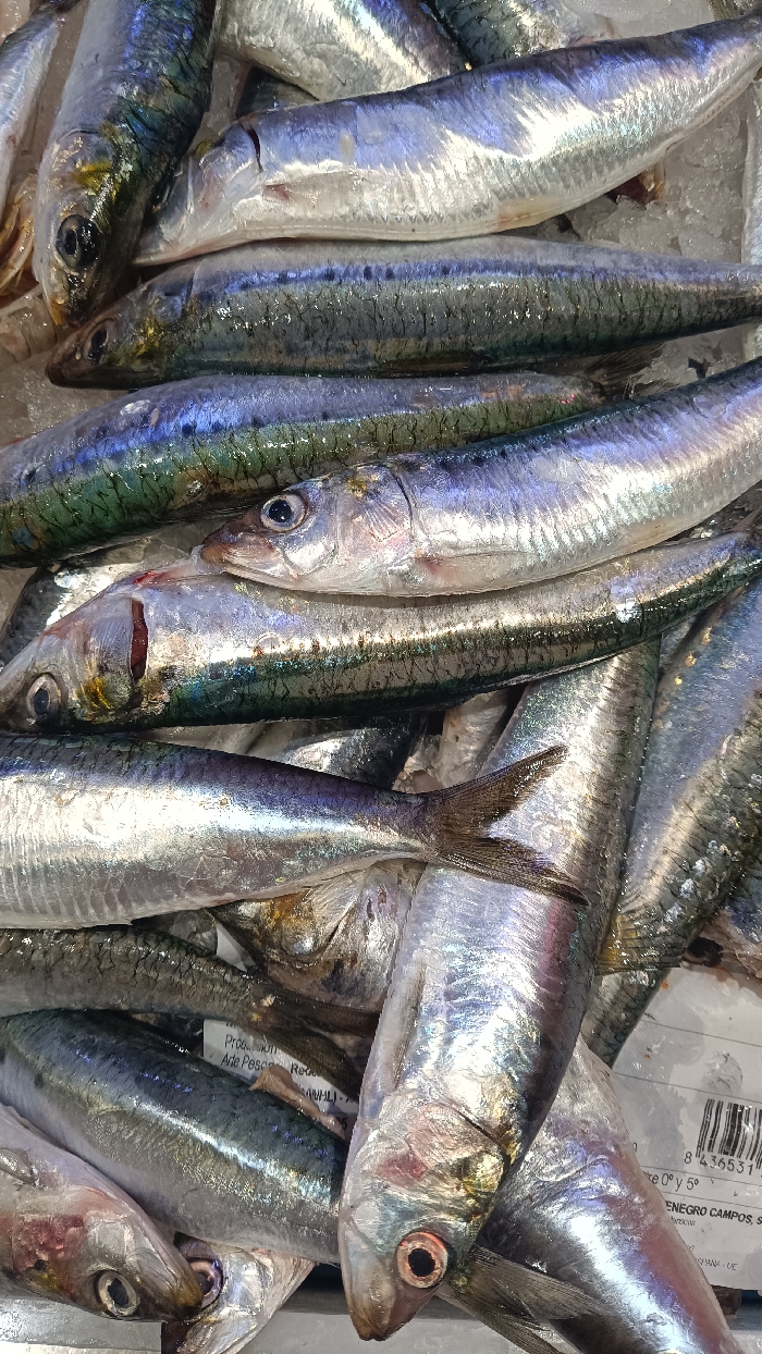 - "The image presents a close-up, top-down view of a tightly packed display of approximately two dozen fresh, whole, raw sardines" by FM-BdCXB3, licensed under CC BY 4.0