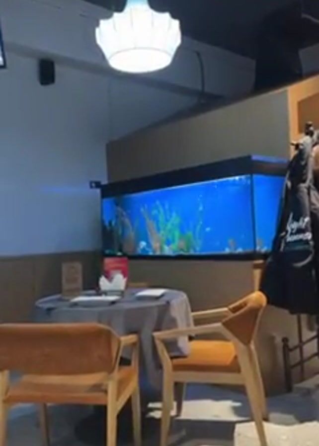 table in a restaurant set for a meal, with a large aquarium in the background. The table is covered with a grey tablecloth, with white plates, napkins, and a red card stand. Two wooden chairs with orange cushions are set on opposite sides of the table. Behind the table is a large aquarium with blue water, colorful artificial plants, and a few fish swimming around. A white lamp hangs from the ceiling above the table. A coat hangs on a rack in the background. The overall environment appears to be a modern, dimly lit restaurant setting.
