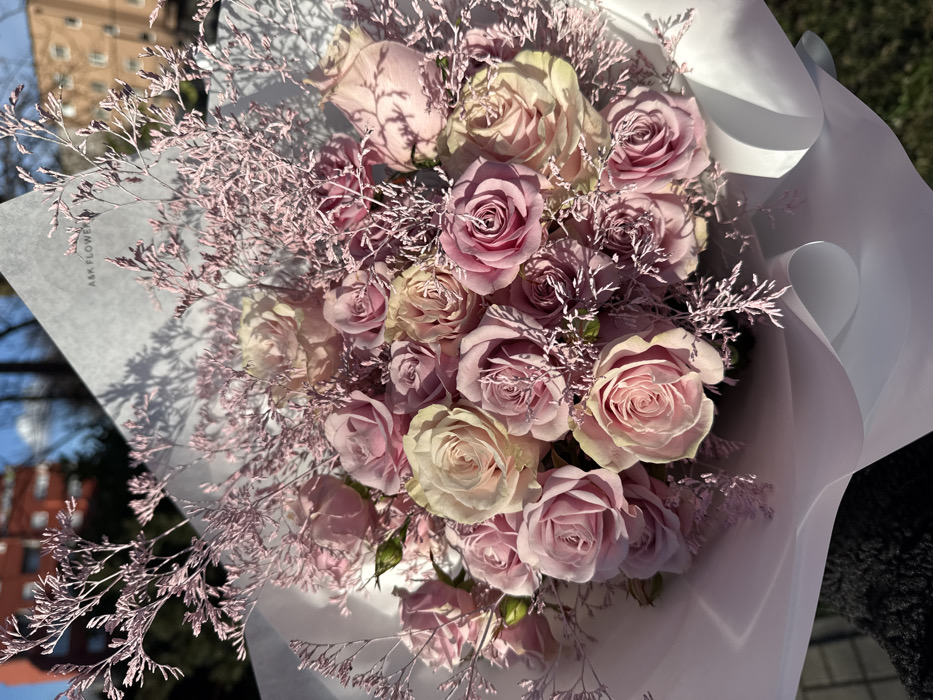 - "An outdoor, eye-level close-up depicts a hand holding a bouquet of approximately twenty-five roses" by FM-NjEox2, licensed under CC BY 4.0