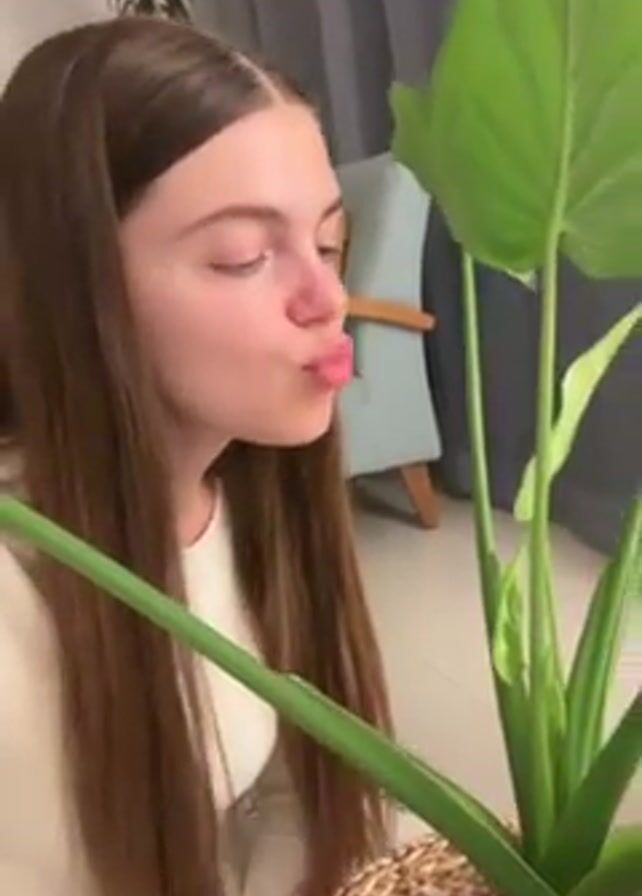A young woman with long, straight brown hair and wearing a light-colored top is shown from the chest up, looking affectionately at a large green houseplant in a decorative pot