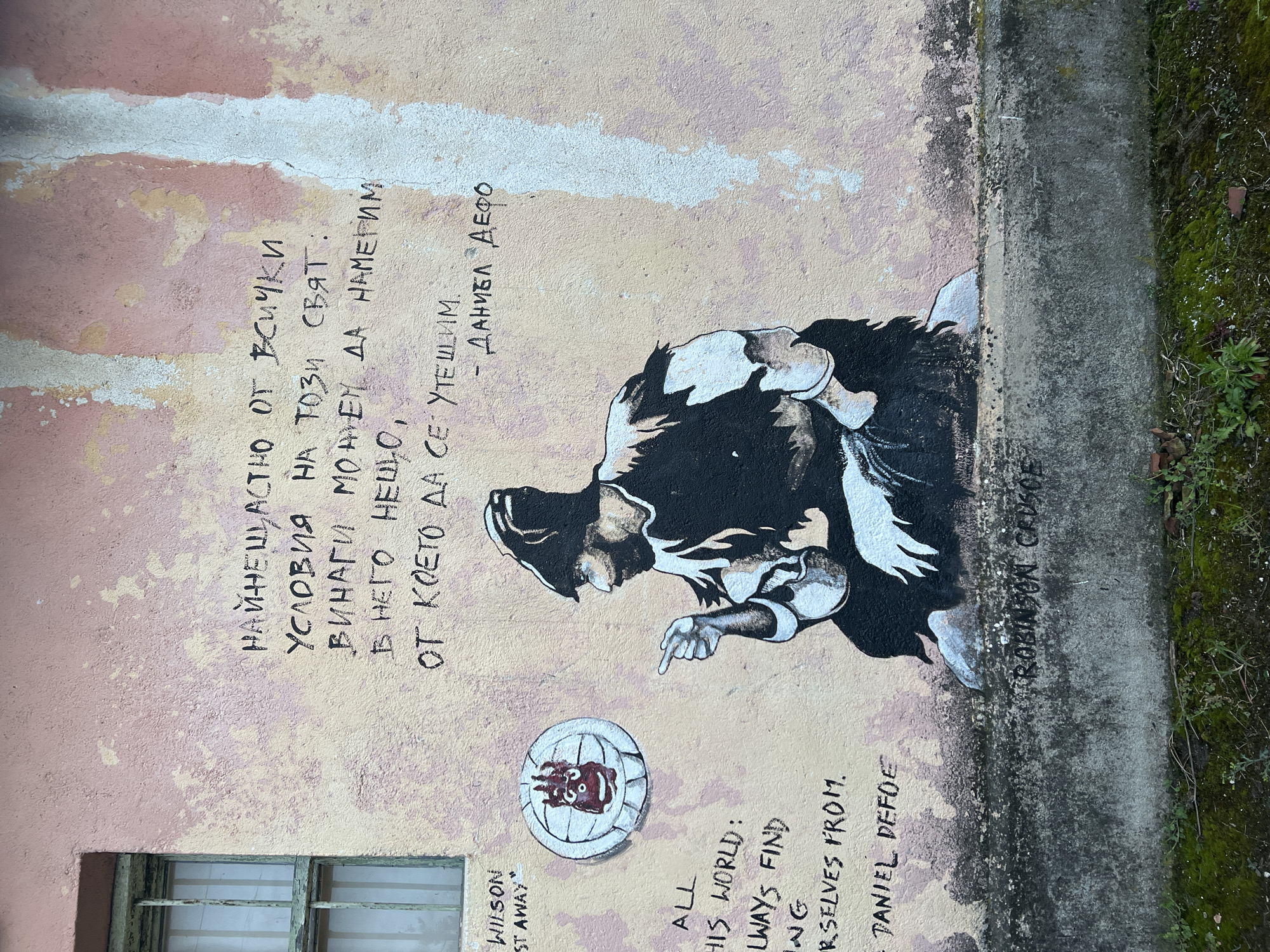 This image shows a mural in Staro Zhelezare, Bulgaria. The mural is painted on a peach-colored exterior wall. The wall is worn, with areas of peeling paint and discoloration. The bottom of the wall meets a concrete border. Adjacent to the concrete border is overgrown vegetation. The mural includes a black and white portrait of a crouched figure pointing downwards. To the left is a rendering of a Wilson brand volleyball with a red drawing on its surface. Text is written above and below the portrait in both Bulgarian and English. The text includes the phrases "WILSON STAY AWAY," "ALL THIS WORLD," "DANIEL DEFOE," and "ROBINSON CRUSOE." A small window is visible to the left of the mural.