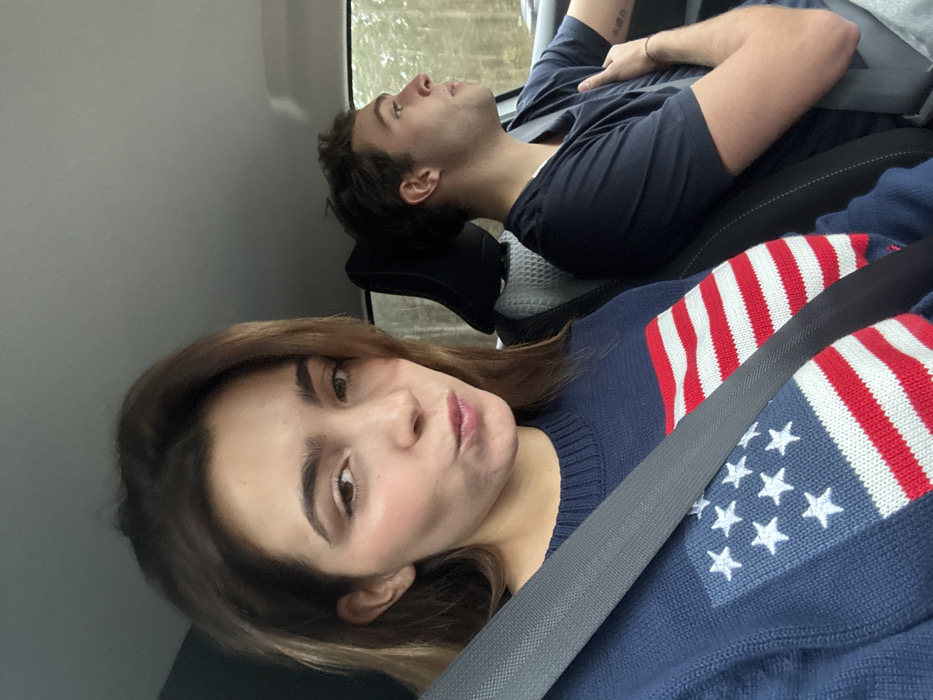 The image depicts two individuals inside a vehicle. A female occupies the front passenger seat, positioned in the foreground and looking directly at the camera with pursed lips. She has brown, shoulder-length hair and is wearing a navy blue knitted sweater featuring a design resembling the American flag, with white stars on a blue field and red and white stripes. A gray seatbelt crosses her chest. Behind her and to the right, a male occupies the driver's seat, viewed in profile. He has short, dark hair and is looking forward and to the right. He wears a dark blue t-shirt, and a tattoo is partially visible on his left forearm. The interior of the vehicle shows a gray headrest and a light gray ceiling liner. Through the windows on the right, blurred green foliage is visible, suggesting an outdoor, possibly wooded, environment. The specific location in the city of Vila do Conde, Portugal, is provided by context and not discernible from the visual evidence within the image.