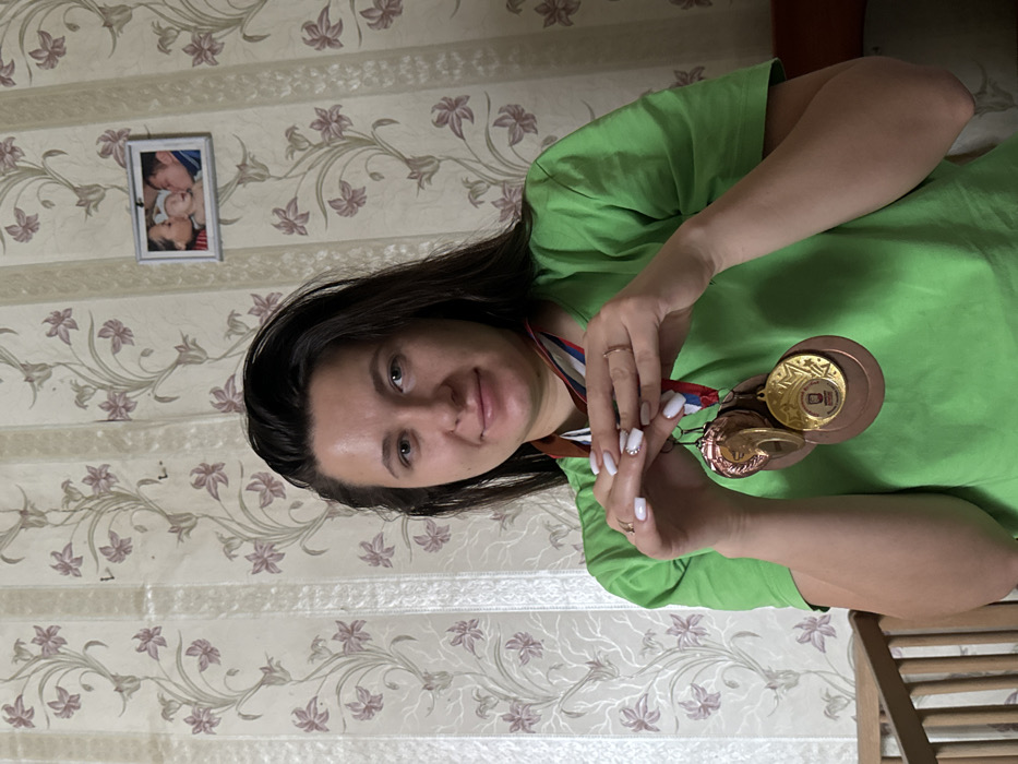 A female subject, approximately 20-30 years old with long dark hair, is depicted indoors in a domestic setting within Красный Маяк, Russia. She is wearing a bright green short-sleeved t-shirt and has light-colored manicured fingernails, including a decorative element on her ring fingers. A thin gold-colored ring is visible on her left ring finger. The subject is holding a collection of three medals with both hands, positioned in front of her chest. The medals include one gold-colored, circular medal with an emblem, and two bronze-colored medals, one circular and one with an irregular shape. The medals are attached to ribbons, at least one of which displays the colors white, blue, and red. The background wall is covered with wallpaper featuring a repeating vertical pattern of light-colored stripes alternating with floral vines in purple/pink and green on a cream or beige background. A small, light-framed photograph depicting two adults kissing a baby is mounted on the wall to the upper right. A partial view of a light-colored wooden crib or cot railing is visible to the lower left, and dark wooden furniture is visible to the lower right.