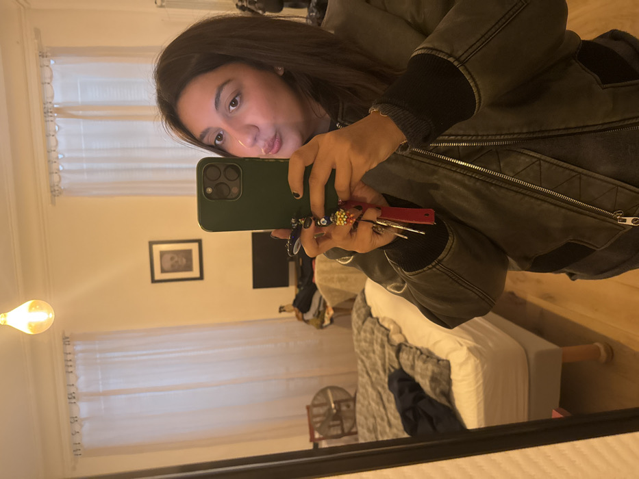 A female individual is depicted taking a mirror selfie within an indoor room, identified as being located in Marseille, France. She holds a dark green-cased smartphone, likely an iPhone model with three prominent rear camera lenses, using it to capture her reflection. Her right hand, exhibiting dark nail polish, holds a set of keys attached to multiple keychains, including a red rectangular fob, several beaded ornaments, and a blue 'evil eye' charm. She wears a dark grey or olive green bomber-style jacket with ribbed cuffs and hem, over a grey garment. Her dark hair is parted on the left, and her lips are pursed in a 'kiss' gesture. The reflected background reveals a room with light-colored walls and two windows covered by translucent white curtains. An illuminated, teardrop-shaped light bulb hangs from the ceiling. A framed picture depicting what appears to be a skull or face is mounted on the wall. Below this, a dark-screened monitor or television is visible on a surface where additional items or clothing are piled. To the left, a bed with a white mattress, light grey sheets, and a darker grey/blue duvet is present. A wooden chair with a circular back is visible near the foot of the bed, with a fan resting on it.