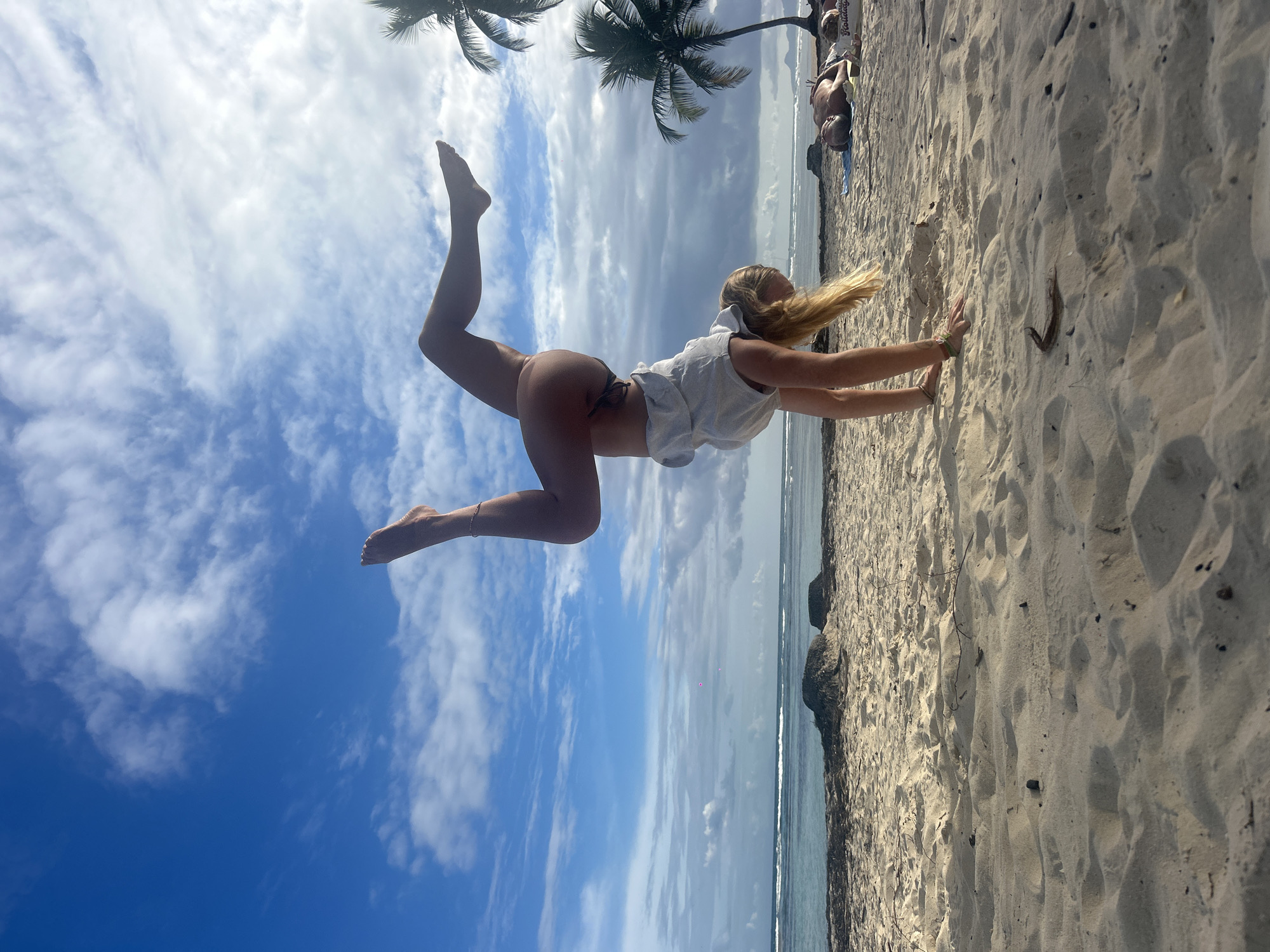 A woman is performing a yoga pose on a beach. Her hands are on the sand, while her body is parallel to the water, and her legs are lifted into the air towards the sky. The location is Sainte-Anne, France, as evidenced by the tropical setting including palm trees and a sandy beach. The sky is mostly blue with some clouds. There are other people on the beach in the background.