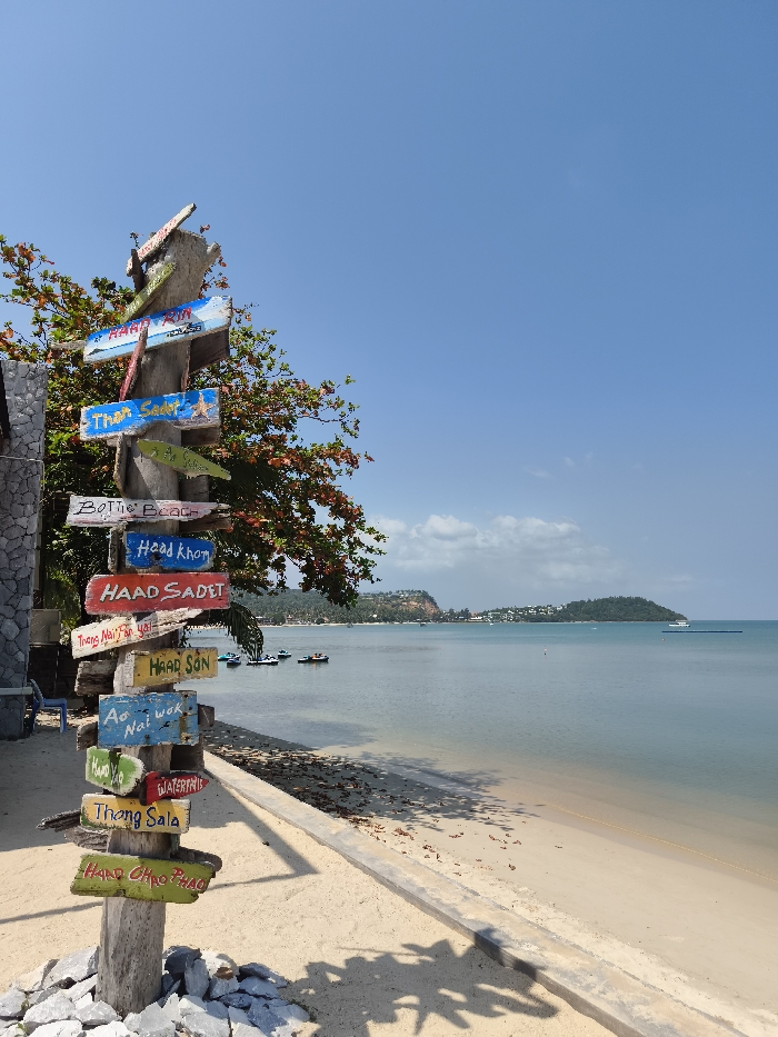 A weathered wooden signpost stands near a sandy beach. Multiple painted signs affixed to the post point to various destinations: "HAAD RIN", "Than Seder", "Bottle Beach", "Head khom", "HAAD SADET", "HAAD SON", "Ao Nai wok", "Thong Sala", and "HAND CHAO PH". The azure sea stretches towards a distant, hilly coastline under a clear blue sky. A row of rocks lines the base of the post, and some sparse greenery is present. The scene suggests a tropical tourist destination.
