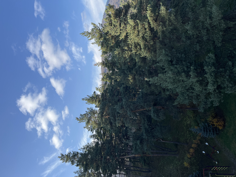 A verdant expanse of coniferous trees fills the right side of the frame, their dense canopies casting shadows below. A glimpse of mountain is seen in the background. To the left, a vibrant blue sky is adorned with fluffy white clouds. The ground below the trees has some grass and children's playground equipment.