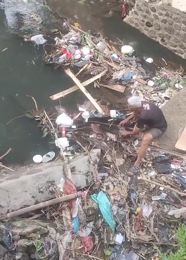 A medium shot shows a man in a black shirt and dark shorts squatting near a trash-filled canal. He has gray hair and is crouched in front of a pile of debris, seemingly sifting through it with his hands. The canal is filled with a variety of trash items, including plastic bags, bottles, containers, and organic debris like branches and leaves. Some trash is also piled on the bank of the canal. The canal walls are made of concrete and stone. There is some green foliage visible on the far side of the canal.