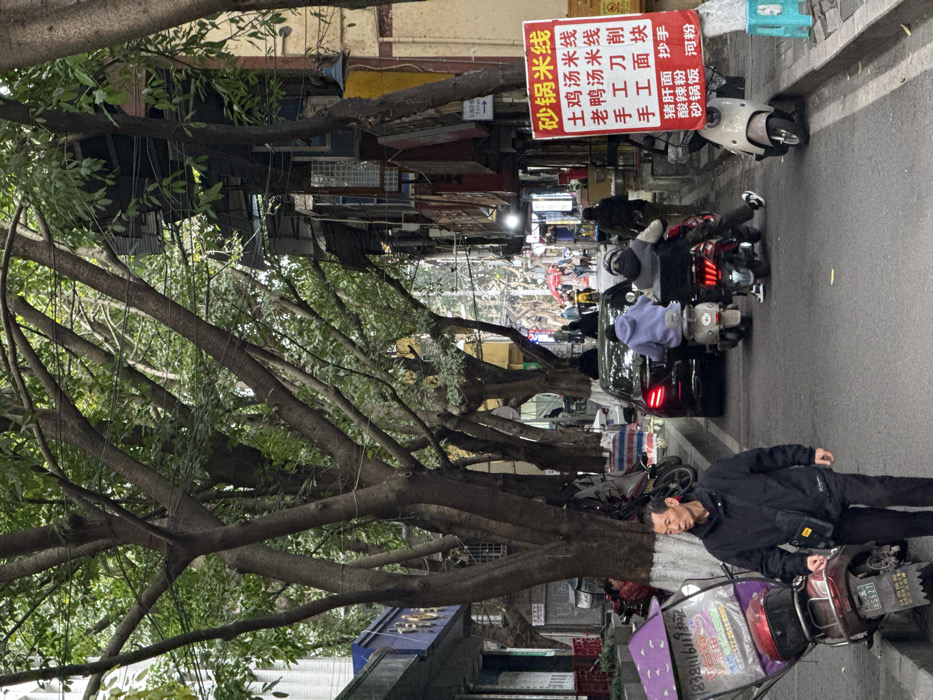 This image depicts an active urban street scene in Beibei, China, characterized by dense tree cover, multi-story buildings, and a mix of pedestrian and vehicular traffic. In the immediate foreground, a middle-aged East Asian male wearing a dark jacket and dark trousers with a black shoulder bag walks from right to left across the paved street. To his left, parked on the sidewalk, is a red moped equipped with a large, purple, rectangular delivery box strapped to its rear rack. The moped's license plate, partially visible, reads "A 856Z7". Further along the left sidewalk, several other two-wheeled vehicles are parked, and a person in a red top is seated. In the midground, the street is occupied by a dark-colored sedan, likely a Mercedes-Benz given the tail light design, which is positioned behind two scooters. The first scooter, light-colored, carries a rider wearing a light purple hooded sweatshirt. The second scooter, predominantly red and black with bright red tail lights, has a rider in a dark jacket and black helmet, and features a black delivery box on its rear. These vehicles appear to be in motion or paused in traffic. The street itself is a narrow, asphalt surface. Numerous mature trees with thick, dark trunks and dense green foliage line both sides of the thoroughfare, creating a canopy overhead. The bases of some tree trunks on the left are painted white. On the right side of the street, a large red rectangular sign with white Chinese characters is prominently displayed on the sidewalk, likely indicating a menu for a food establishment, listing items such as "Clay Pot Rice Noodles," "Chicken Soup Rice Noodles," and "Pork Liver Noodles." A light blue plastic stool is situated next to the sign. Behind the sign, multi-story buildings with varied, aged facades rise, displaying exposed wiring and a mix of materials. One building on the right exhibits sections of yellow and beige paint. In the background, the street continues into the distance, with a dense cluster of people visible, indicating an active pedestrian area. Overhead, numerous electrical wires crisscross between the buildings and trees.