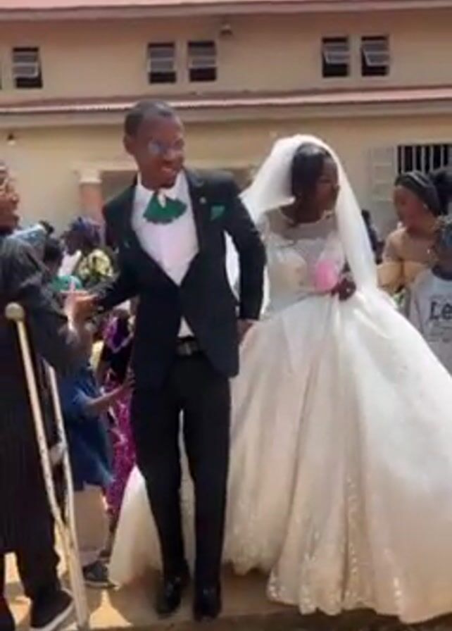 A newly married couple is shown walking down steps outside of a building. The groom, wearing a black suit with a green bowtie and glasses, holds the hand of the bride, who is wearing a large, white, formal wedding dress. The bride is also wearing a veil and holding a pink bouquet. Behind the couple are many people, some of whom appear to be looking at the couple. One man in the group is using crutches to walk. The building behind them is two stories tall and peach-colored. The sky is blue and mostly clear.