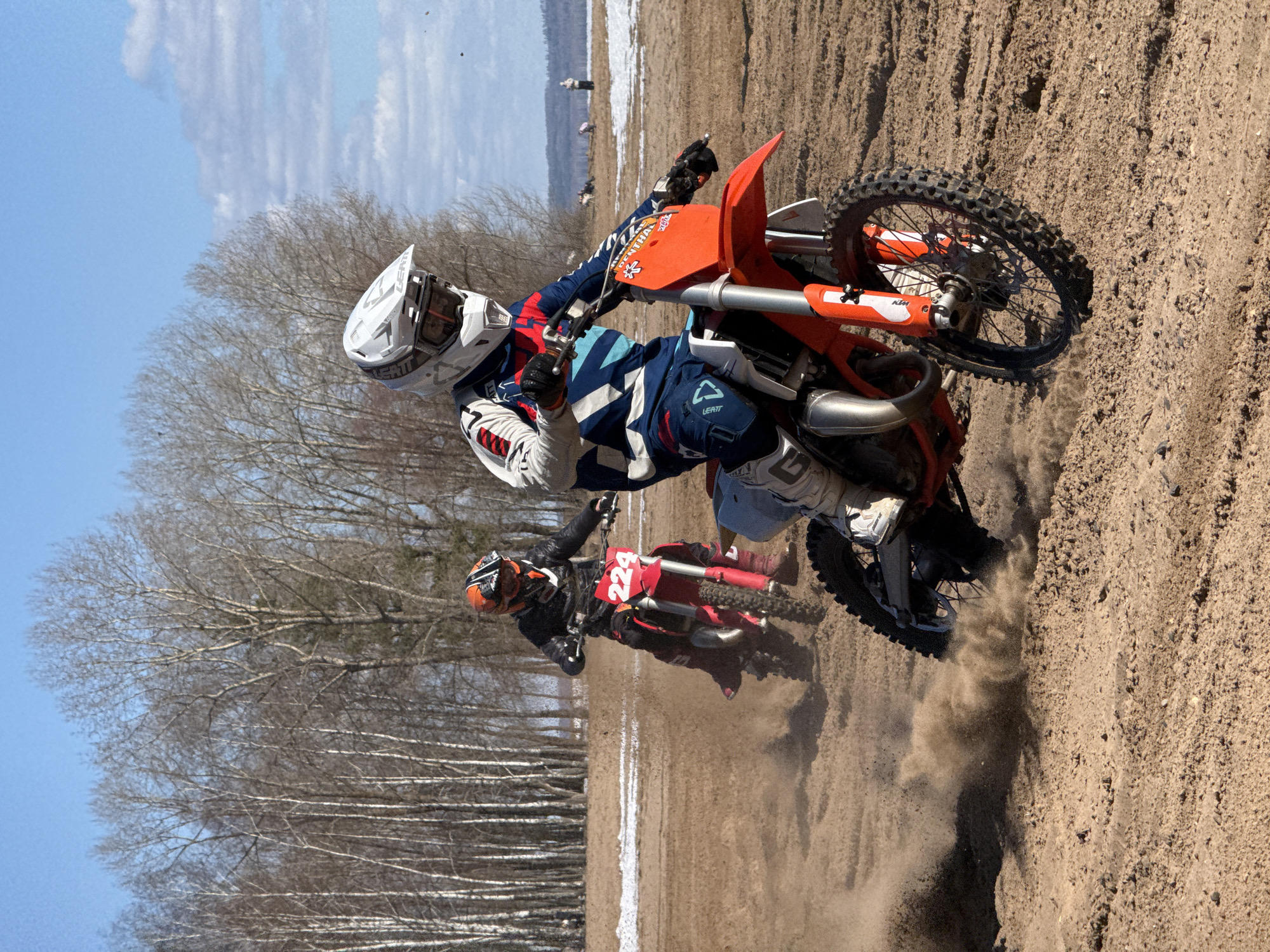 The image captures two motorcyclists riding on a dirt track. The foremost rider is on an orange motorcycle, wearing a white helmet, and a blue and white racing suit. The second rider trails behind on a red motorcycle. The location appears to be an outdoor dirt track with bare trees and patches of snow in the background. The image seems to be taken in a rural setting, but the location within the city of Noviy, Russia, is not clear. The riders are actively engaged in motorcycle riding.