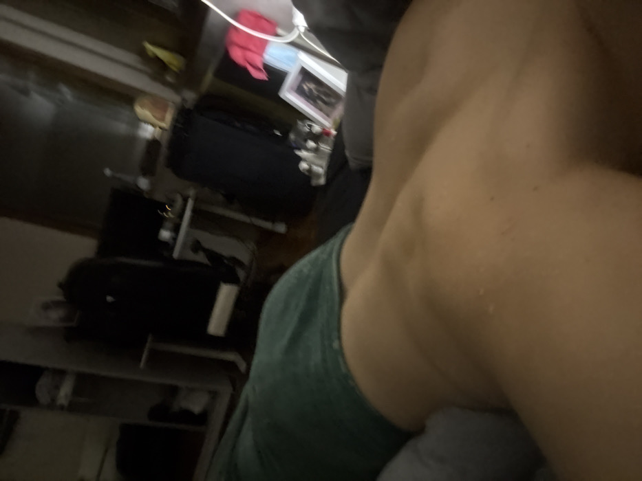 A dimly lit indoor scene, reportedly located in Trudovets, Bulgaria, is captured from a low perspective. The foreground features the lower back and upper buttocks of an individual, who is positioned face down. A dark green fabric garment, possibly shorts or a towel, partially covers the upper gluteal region. The exposed skin of the lower back and upper thighs exhibits visible muscle definition. The background, significantly out of focus, depicts a room containing a dark office chair, a white desk with a dark monitor, and shelving units. Other discernible objects include a framed picture, a red cloth, and white cables near the desk area.