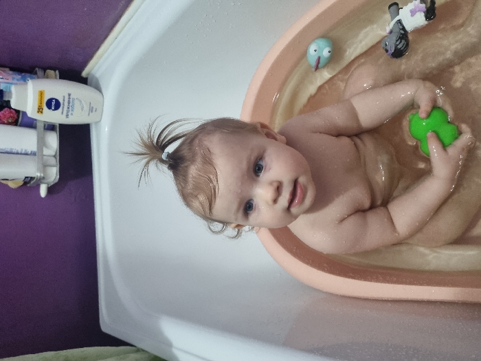- "A baby is taking a bath in a small, peach-colored tub inside a white bathtub" by FM-MGDNO2, licensed under CC BY 4.0