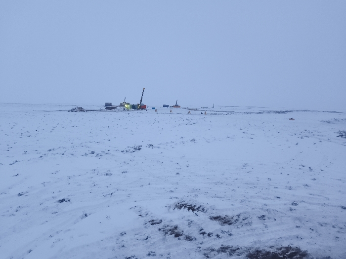 A wide expanse of snow-covered ground dominates the scene. In the distance, an industrial site is visible, featuring heavy machinery and cranes, suggesting construction or extraction activities. The sky is overcast, casting a dim light over the landscape. The overall impression is one of a remote, possibly arctic, location.