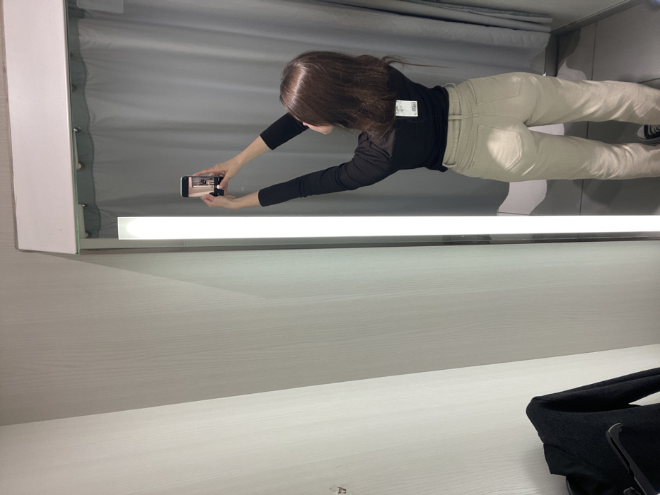 A woman is depicted from behind inside what appears to be a modern retail fitting room. The setting is not consistent with the ancient city of Pompeii, Italy. She wears a black long-sleeve top with a white price tag affixed to the back of the collar, and light-colored, possibly beige, long pants. Black low-top sneakers are visible on her feet. She holds a white smartphone aloft with both hands, aiming it towards a full-length mirror, capturing her reflection as seen on the phone's screen. The mirror features an integrated vertical light strip along its left edge. To the left of the scene, a dark garment is hanging on a black hanger. The walls of the fitting room are a plain light grey, and a grey privacy curtain is visible behind the mirror.